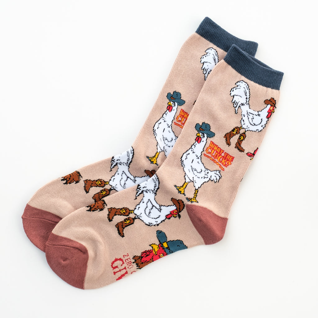 Like the sock says--What the Cluck? The lighter colored, smaller sock is the women's version.